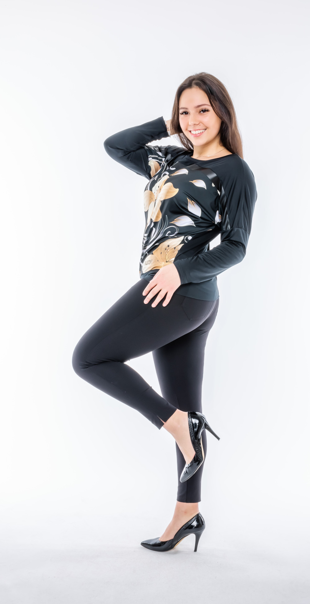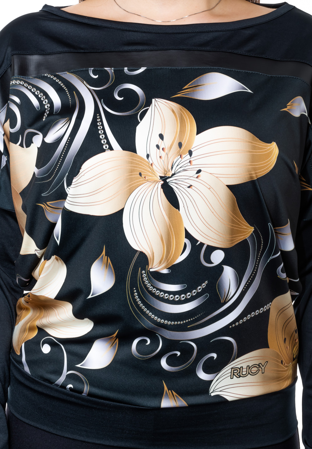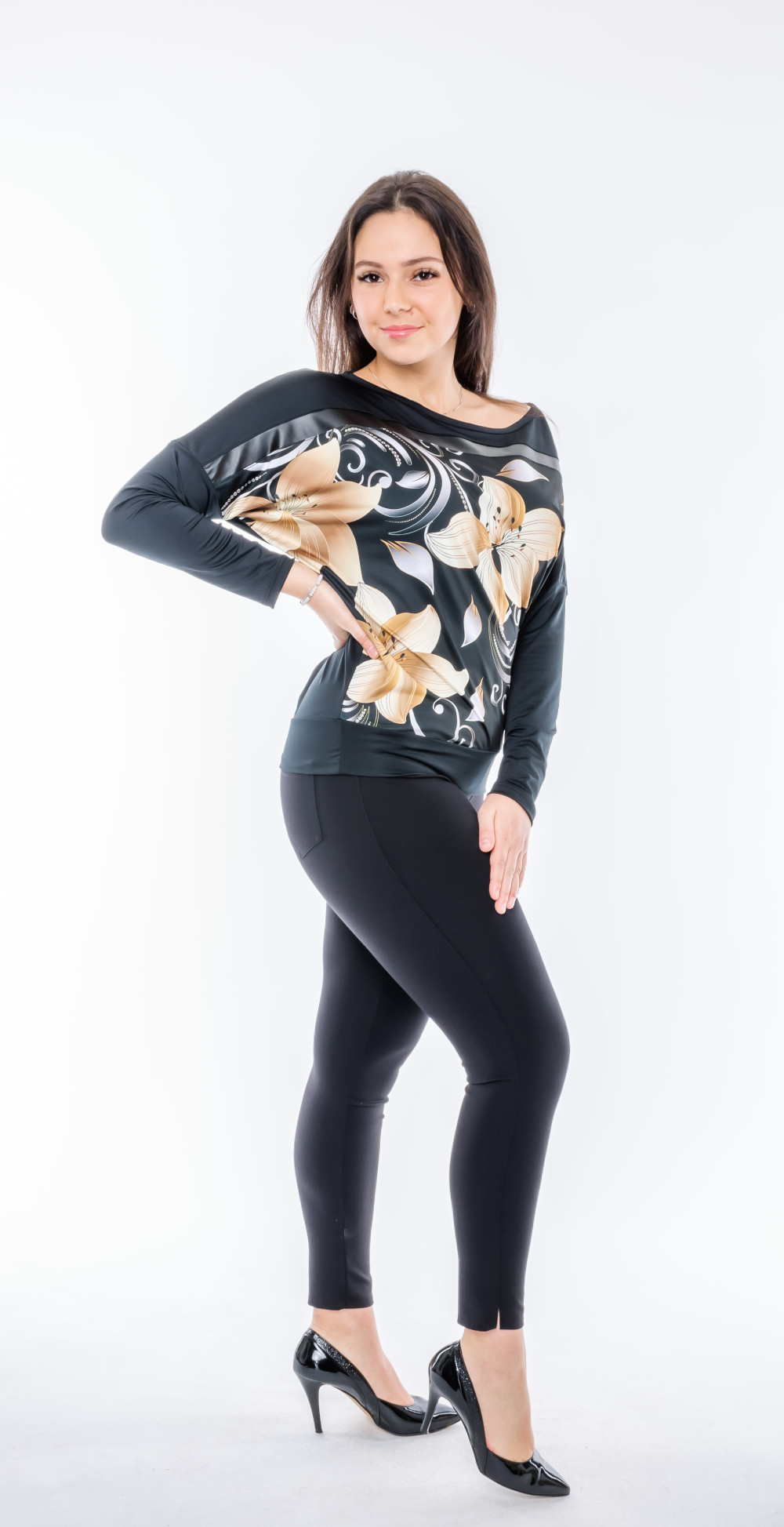 Hosszú ujjú, passzés aljú felső, dekoratív virág gold levél mintával. Rugalmas, puha, sztreccses anyaga kényelmessé és esztétikussá teszi a ruhát, a dekoratív műbőr betétes díszítése pedig izgalmas megjelenést ad neki. Kényelmes és elegáns viselet karácsonykor, az ünnepekre, különleges alkalmakra vagy hétköznapokon.