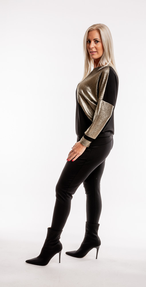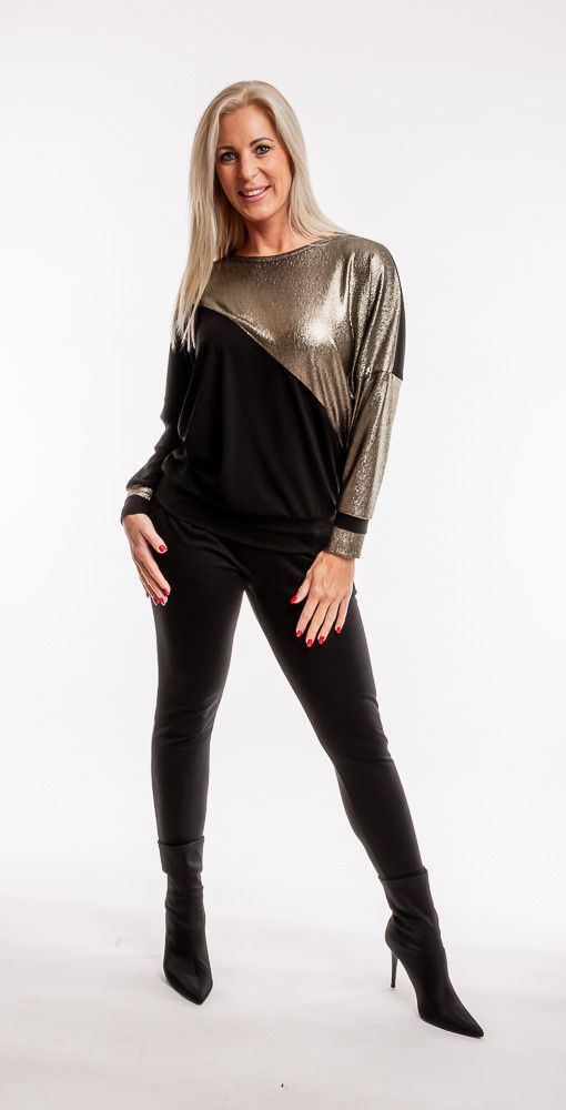 Diszkréten csillogó, apró arany flitteres alkalmi felső, amiben az ünnepek alatt, a bulik alkalmával ragyogni fogsz. Ha kedveled a fekete klasszikus eleganciát, mégis valami egyedit keresel, akkor ez a ruha tökéletes választás.
