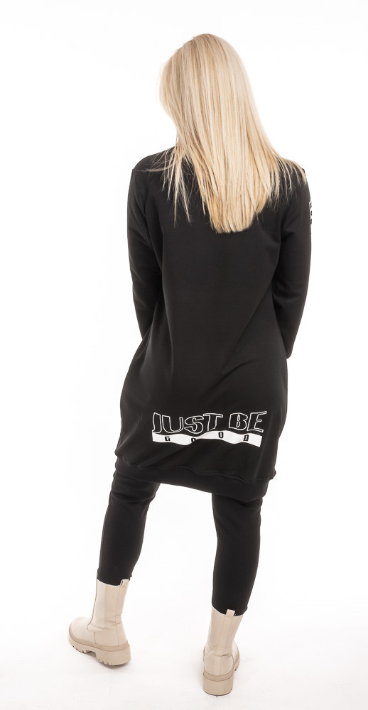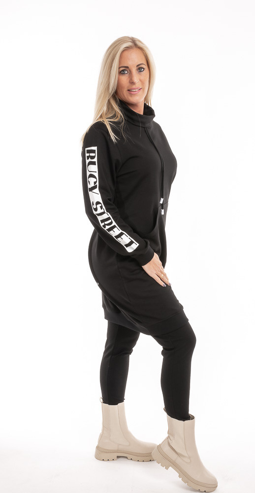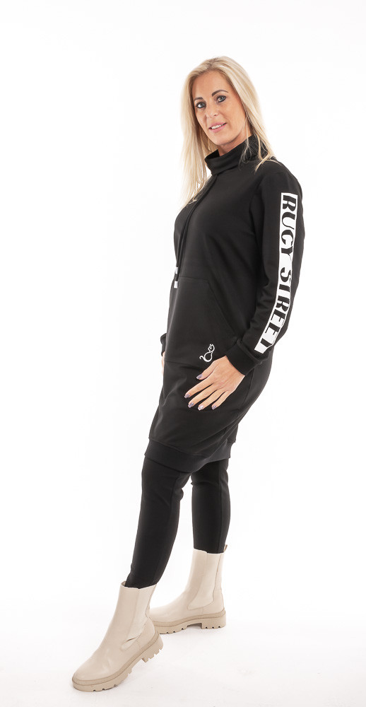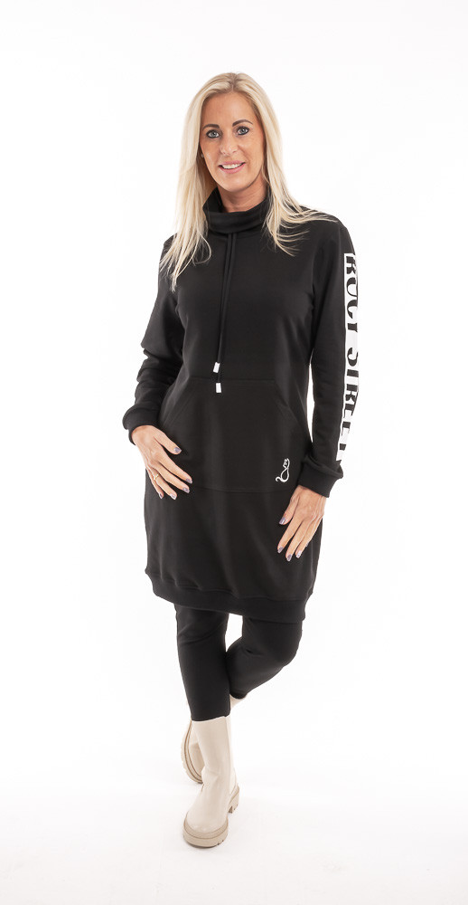 Pamutruha magas nyakkal, kenguruzsebbel. Háta alján, és az ujján kontrasztos szövegü minta. Alakot lazán követő szabásvonal, alján passzé pánt. Kellemes, puha, rugalmas, meleghatású pamut anyag. 95% pamut, 5% elasztan. S-M-L-XL-XXL méret. Leggingsel, tornacipővel egyaránt hordható.