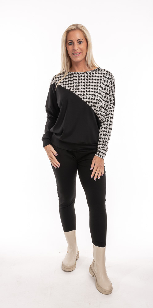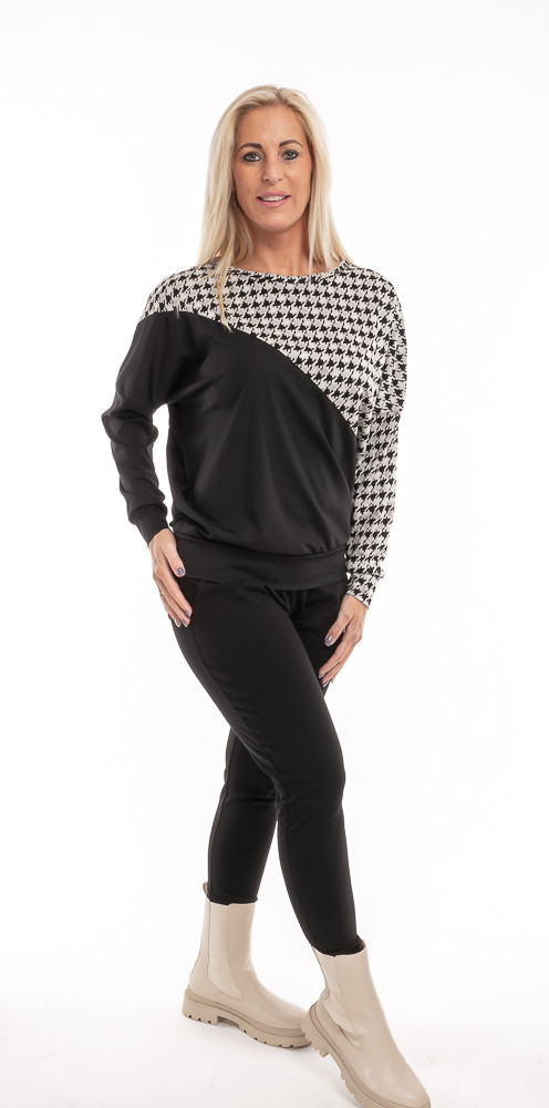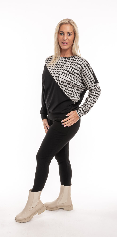 Modern elegancia, mintás részletek. Kontrasztos megjelenés kombinációja lendületes nőies megjelenést nyújt.