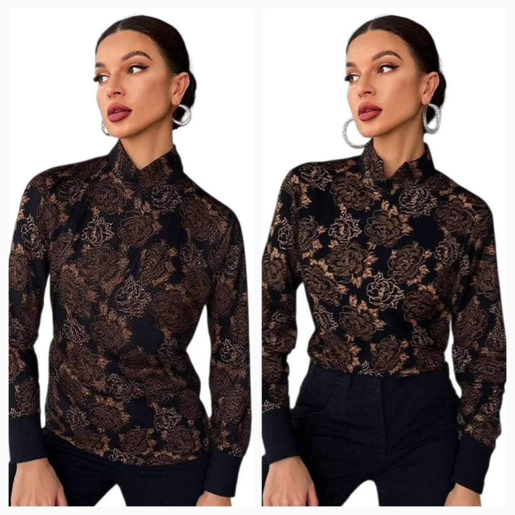 Hosszú ujjú magas nyakú fekete-bronz virágmintás elegáns blúz