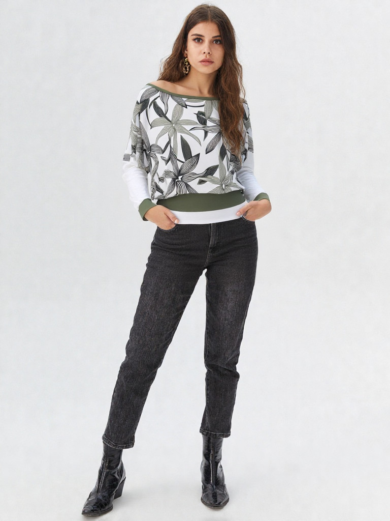 Derékban kontrasztos passzéval összefogott, lezser denevér ujjú fazon, kerek nyakú kivitelben, ujja végén csinos díszpánttal összefogva. Sokoldalúan kihasználható: hogy napközben és este is fölvehesd.