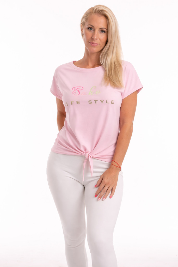 Elegáns hangulatú nyári felső tökéletes a tavaszi, és a nyári meleg napokra. Laza szabású, nőies LINE elölkötős női póló, amely modern megjelenést ad a mindennapi viseletnek. Az elején található megkötős rész kiemeli a derekat, miközben kényelmes, könnyed esést biztosít. Enyhén testformát követő fazonnal rendelkezik, mely könnyedén hangsúlyozza az alakot. A pólót elegáns minimalista vonalrajz minta díszíti, amely különleges és divatos megjelenést ad.