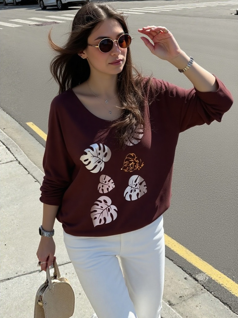 Puha, nőies, lazán illeszkedő női blúz, ami illeszkedik a divattrendhez. Ezt kínálja neked ez a jumper pálma leveles felső. Szabása, stílusa, ujjahossza, mintája és a színe adja eleganciáját, és tökéletessé teszi szinte bármilyen alkalomra. Egyedi kifinomult szabású sportosan elegáns blúz, ami biztosítja a kényelmet, és kiegészíti a stílusod. Rugalmas modal anyagból készült. Több méretet átölel, csípőt takaró modell, alján gumirozott. Mérete: M/L, XL/XXL, 3XL) Plus size méretben is dekoratív felső.