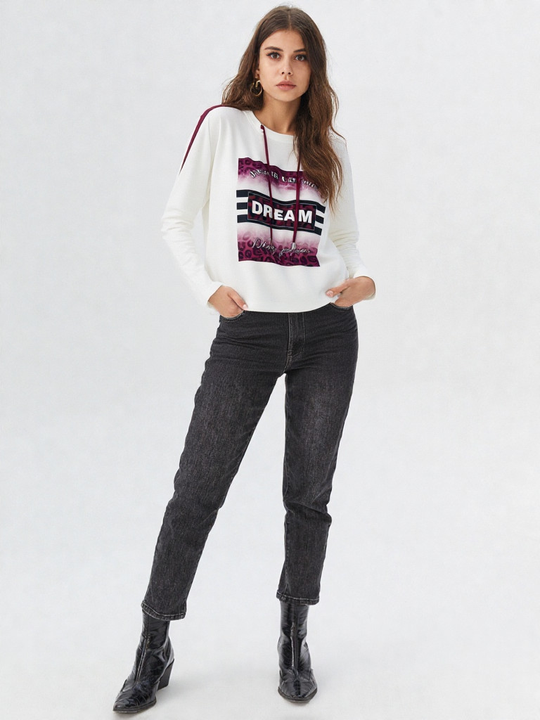 Bármikor fölveheted, garantált a megjelenés ebben a ruhadarabban. Formája dekoratív, ekrü színe, egyedi minta díszítése látványossá teszi. derékban keskeny gumi. Hordhatod, farmerral, sportos szoknyával egyaránt.